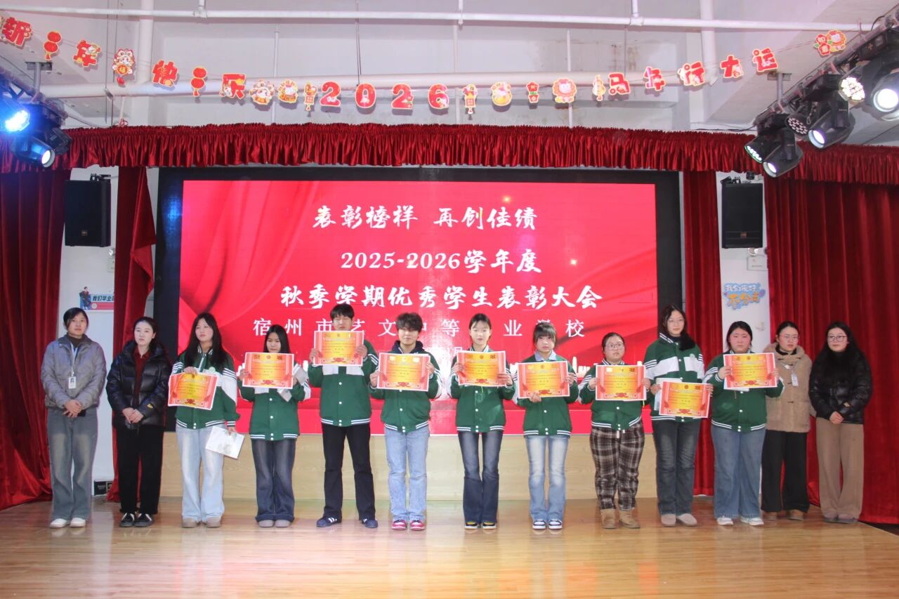歲末回望碩果累,表彰先進(jìn)勵(lì)前行。為表彰先進(jìn)、樹立標(biāo)桿,營(yíng)造積極向上的校園氛圍,1月27日下午,宿州市藝文中等專業(yè)學(xué)校舉行2025-2026學(xué)年第一學(xué)期期末表彰大會(huì),校領(lǐng)導(dǎo)、教師代表及全體學(xué)生齊聚現(xiàn)場(chǎng),共同見證榮耀時(shí)刻,凝聚奮進(jìn)力量。